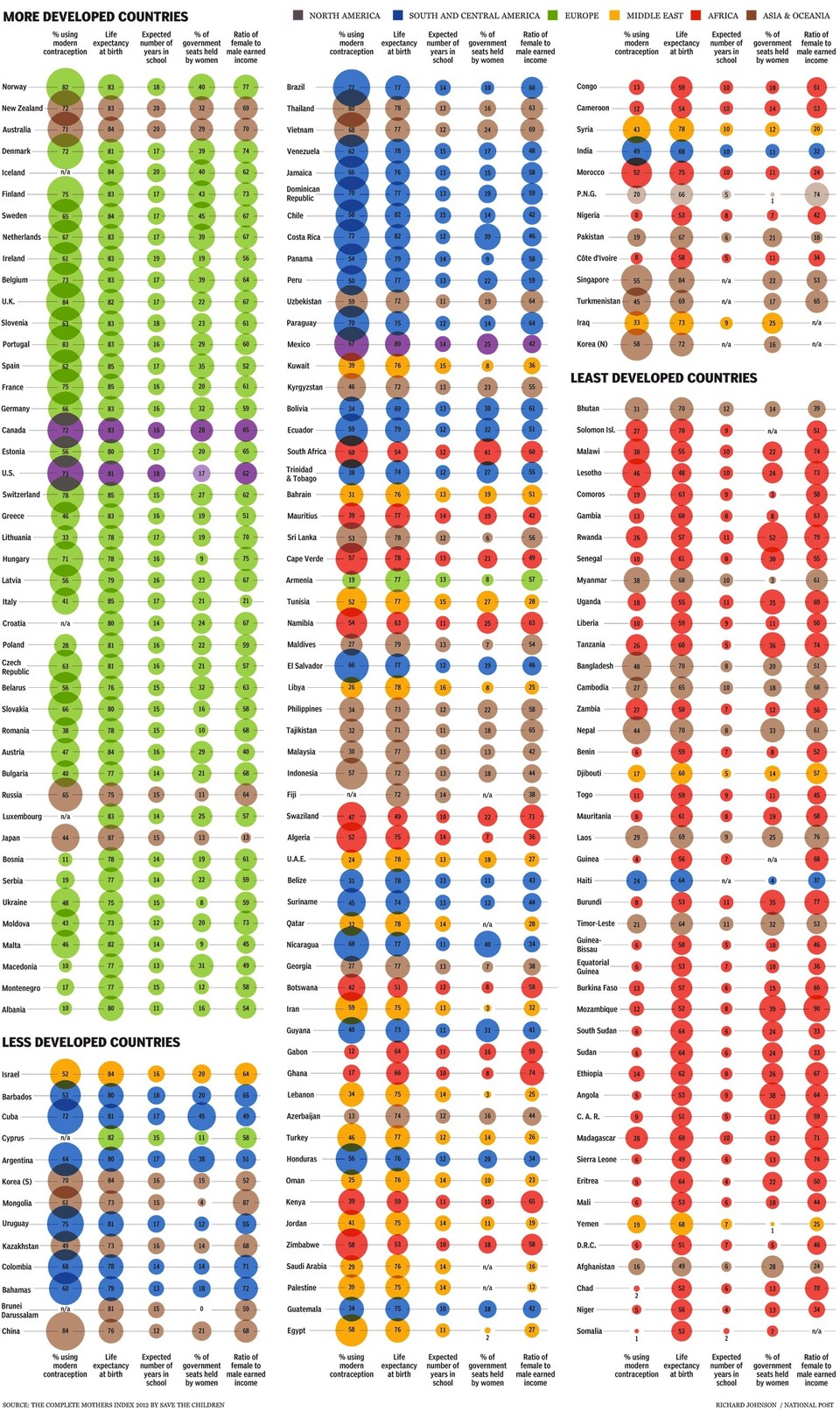 So, I found the incredibly detailed and visually impressive infographic by the National Post, pulled from spectacular data and research done by Save the Children to be particularly fascinating. What they did was combine information on the health, economic, and education status of women to create overall rankings of the best and worst countries for women, splitting the countries into categories of more developed, less developed, and least developed, and the countries were ranked in relation to the other countries in their category (the divisions were based on the 2008 United Nations Population Division’s World Population Prospects, which most recently no longer classified based on development standing). While these divisions and the rankings can certainly be contentious and may incite some disagreement (nothing unusual there, these kind of rankings usually are), I thought the results were interesting. Some highlights – Norway is first, Somalia is last. The United States was 19th, and Canada was 17th (Estonia fell in between us and the Great White North) in the most developed. Israel is first in the less developed category, and Bhutan is first in the least developed category. The full report with data from Save the Children is also available, if you want to learn more about the information combined to make this image. Take a look: